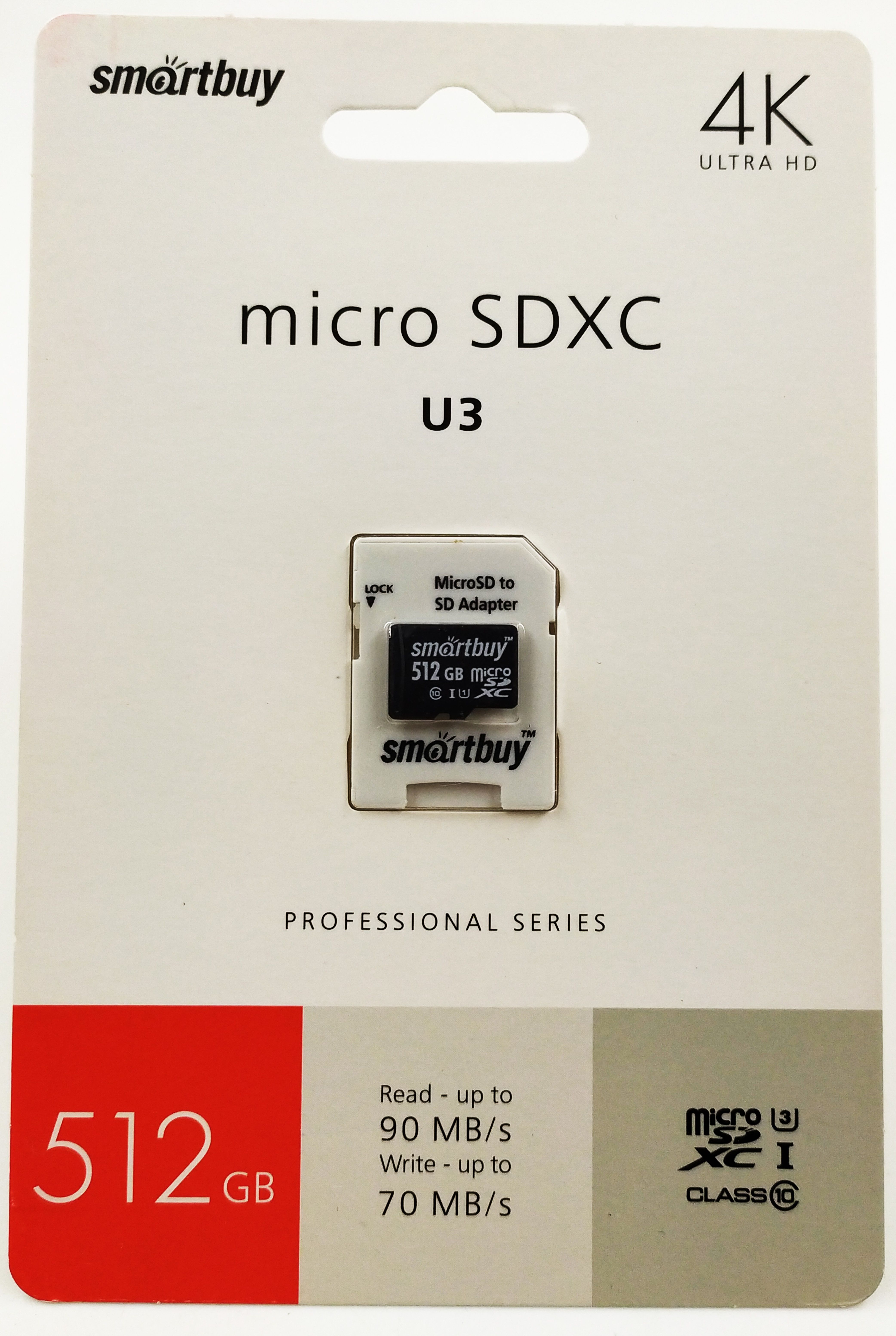 micro SDXC карта памяти Smartbuy 512GB Class10 PRO U3 R/W:90/70 MB/s (с адаптером SD)