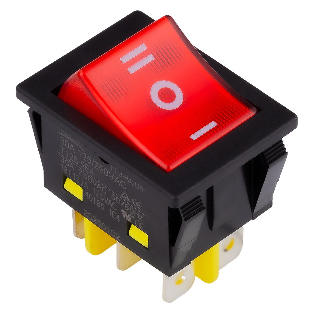 Переключатель клавишный 250В 32А (6с) ON-OFF-ON красный с подсветкой и нейтралью (SBE-32-S32r)