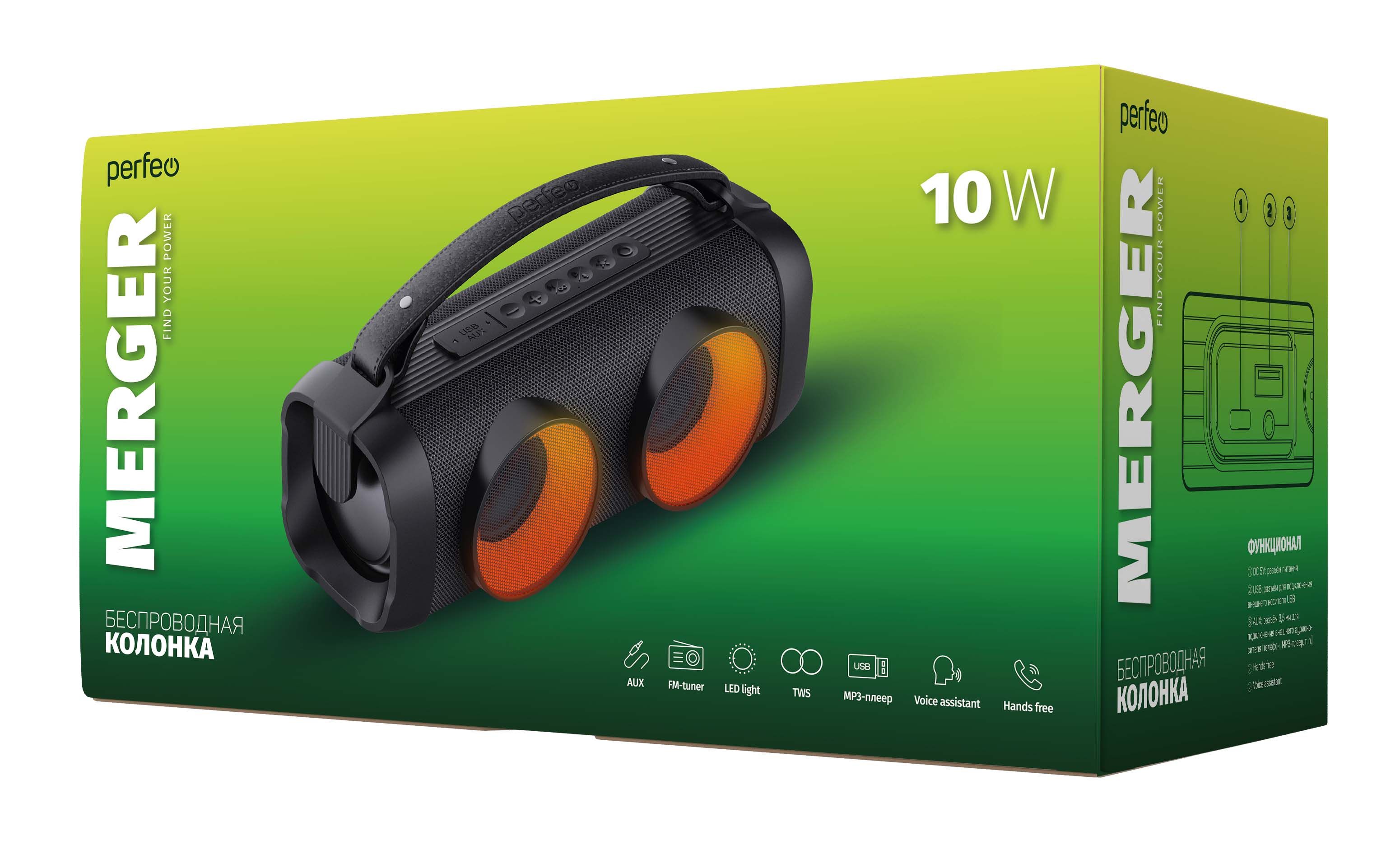 Perfeo Bluetooth-колонка "MERGER" FM, MP3 USB, AUX, TWS, LED, 10Вт, 2200mAh, черная