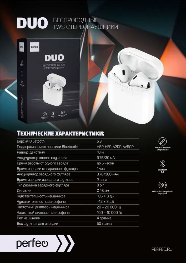 Perfeo BT TWS наушники вкладыши DUO белые автосопряжение