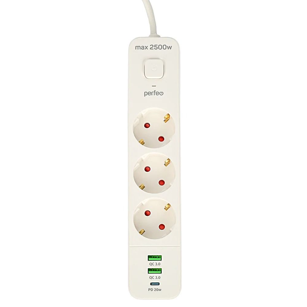 Perfeo сетевой фильтр "POWER SPRING", 2500W, 4,0м, 3 розетки, 2USB +1TYPE-C (QC3.0+PD 20W) белый.